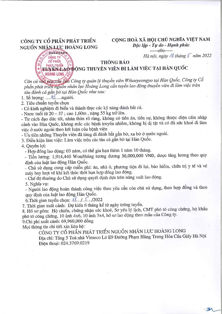 THÔNG TIN TUYỂN DỤNG ĐI LÀM VIỆC TẠI HÀN QUỐC 18-05-2022