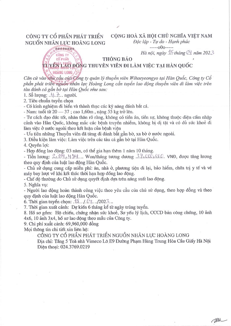 THÔNG TIN TUYỂN DỤNG ĐI LÀM VIỆC TẠI HÀN QUỐC 15-04-2023